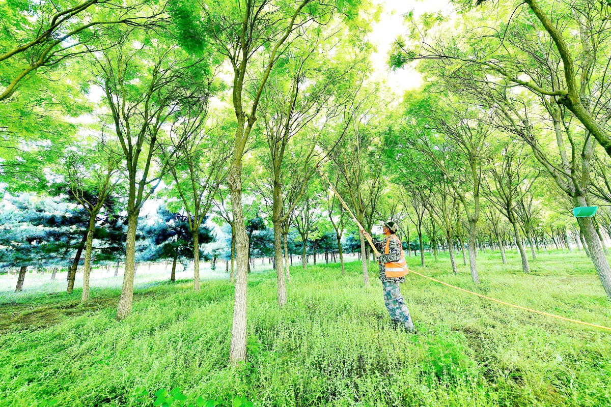 改造提升城市公园,利用街边空地和裸露地块建成口袋公园及休闲公园、大力推进村庄绿化美化……近五年来,城市副中心城区人均公园绿地面积和公园500米服务半径覆盖率稳步提升,结合疏解整治促提升、老城双修等工作,共完成“留白增绿” 6000余亩。图为西集集体林场工作人员正在林间作业。(资料图)记者 唐建/摄
