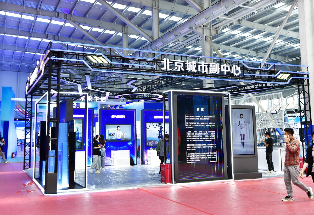 位于城市绿心森林公园的副中心会场面积约为1.4万平方米,在户外设置了“创新之城”“双奥之城”“绿色之城”“魅力通州”四大展区,在室内还设置有“北京争先”板块。值得一提的是,“魅力通州”展区位于绿心南门的足球场区域,约700平方米,展区以简约灰、白为主色调,分展区各主题辅以科技蓝、生态绿、关爱橙等鲜明色系,以“走进科技 你我同行”为主题,通过艺术化的场景设计、高科技的展陈手段、趣味化的互动体验,为大众打造一处“七日科普体验厅”。
