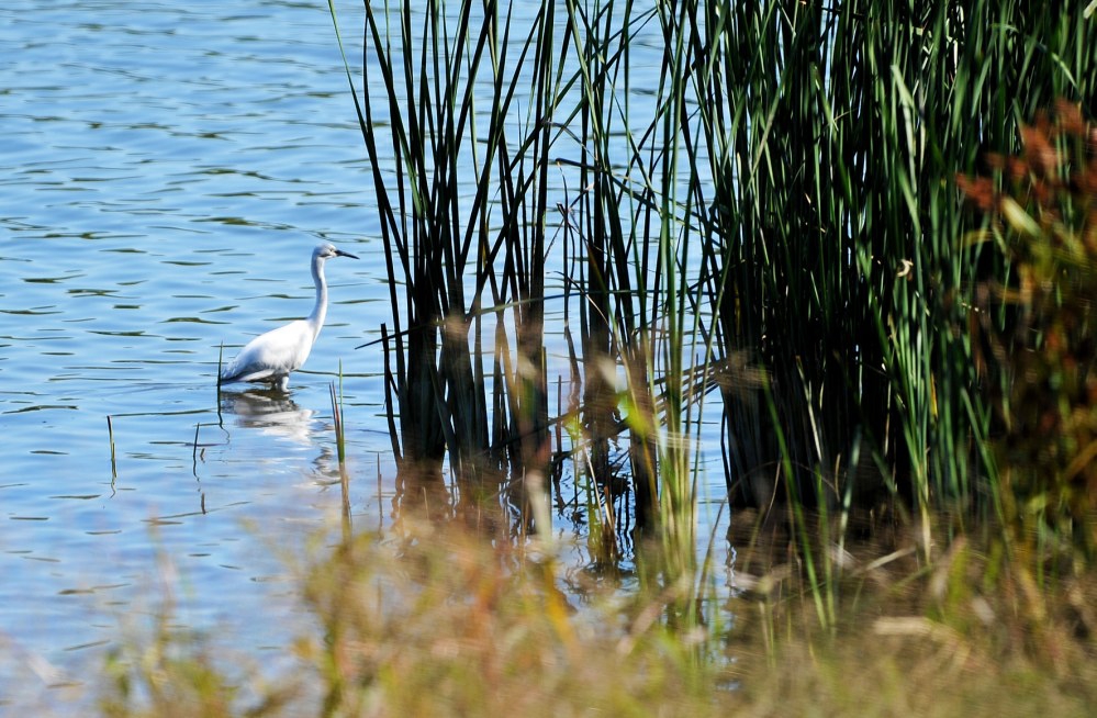 下午两点,正是水鸟觅食高峰期。记者一行在镜河与镜湖衔接处驻足。“听,这是红脚隼的叫声!”记者连忙回头张望寻找,不见红脚隼,却看到了三只山斑鸠绕着两棵小树追逐,这是临镜路上最先偶遇的小鸟。
