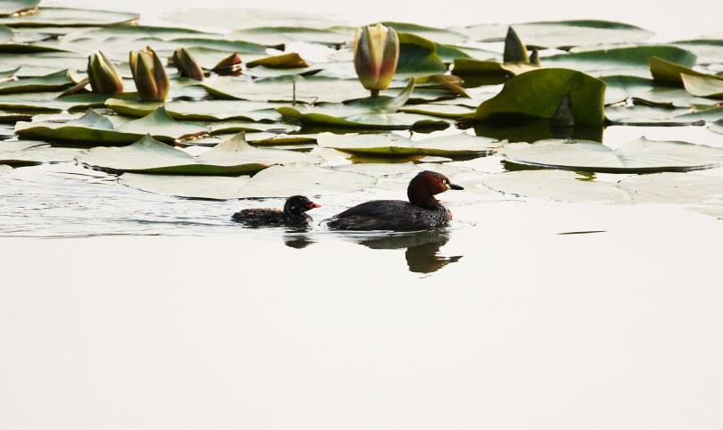夏末的镜湖蝉鸣不绝于耳,近处,一只凤头鸊鷉精气神儿满满地游来,尽管正处于繁殖羽向冬羽过渡期间,不是那么好看,但它仍然昂着头“检阅”周遭。一眨眼功夫,这只凤头鸊鷉便不见了踪影,十几秒后又出现在五米开外的水域,露出白胸脯。