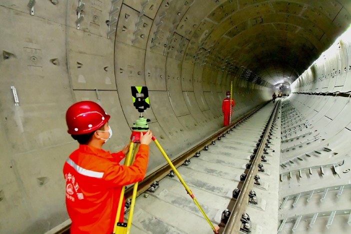 工人对次渠北站至北神树站隧道内道床及轨道进行测量。 记者 唐建/摄