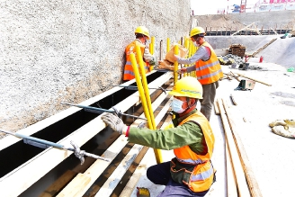 工人铺装地下结构防水保护层。