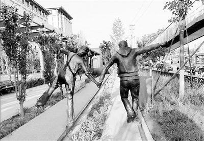 京门铁路主题公园占地面积约1.8万平方米,是一个狭长条形的街心公园。这里除了各式各样的绿植和花草,最多的就是跟铁路有关的主题陈设。