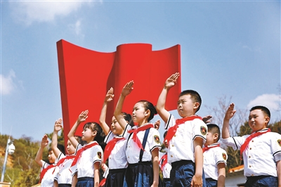 | 2021年,房山团区委推出《为祖国而歌》情景式主题团课,少先队员在课上敬队礼 |