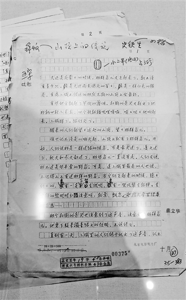 从小院径直走,便到了十月文学院展厅,门口展示牌上写着“长河 中国文学的传统与今天”,南边墙上是中国现代文学简史,有鲁迅、陈独秀、郭沫若、茅盾、徐志摩、冰心等文坛大家的生平资料展示;下面玻璃柜台里,有十月文学院珍藏的文件和手稿:1978年《十月》文学期刊的创刊号,时光流逝40多年,书皮早已泛黄;还有史铁生《山顶上的传说》手稿,“天还是灰蒙蒙的时候,那群鸟儿又飞起来了,数不清有多少只……”方格稿纸上,有史铁生用红笔改动一些词句的痕迹。