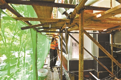 为进一步改善居民居住环境,提升城市品质,今年海淀区将对罗庄东里小区、万泉庄北社区等19个老旧小区,共计109栋楼实施老旧小区综合整治工程,预计11月底前全部完工,将惠及居民8788户。北京青年报记者了解到,在紧盯疫情防控工作的同时,海淀区老旧小区改造工作目前已全面复工复产。图为海淀区北太平庄街道罗庄东里社区正在进行小区楼体外墙改造提升。