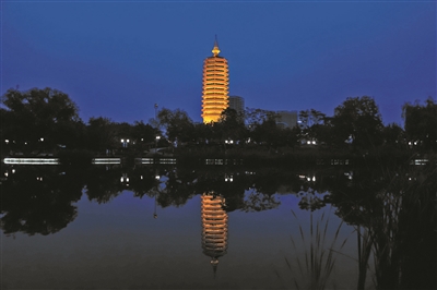 背景延伸:燃灯塔,通州八景之一,始建于北周时期,距今已有1400多年的历史。燃灯塔平面呈八角形,通高56米,为十三层密檐式实心塔,砖木结构。其风铃多达2248枚,为世界之最。全塔所嵌砖雕、灰塑神像424尊。唐贞观七年(633)复建,辽重熙年间(1032-1054)重建,元大德、明成化、清康熙九年(1670)曾经修缮。康熙十八年地震身圮,三十七年(1698)再建塔身。1976年唐山烈震波及刹毁,1987年重修塔顶。