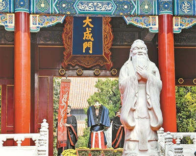 祭孔典礼是中国古代社会的重要礼仪,包括迎神、初献、亚献、终献、送神、望燎等环节,是集乐、歌、舞、礼为一体的一种艺术表演形式,迄今已经有两千多年的历史,在2006年被列入首批国家级非物质文化遗产名录。