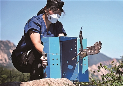 昨日,由北京猛禽救助中心(BRRC)接救的日本松雀鹰和燕隼,在北京鹫峰国家森林公园放归自然,两只小型猛禽均为国家二级保护野生动物。
