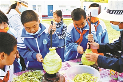 在“巧手鉴丰收”环节,学生们采摘的食材被统一运送到“丰收驿站”,之后再配送到相应的制作坊。碎菜坊、韭花坊、葫芦条坊、什锦坊、五香豆坊、玉米花坊、杂粮坊、手工创意坊……每个制作坊都有一名民间艺人现场展示制作手艺,并耐心地为学生们讲解食品制作流程。看到自己制作出的精美食品,学生们脸上洋溢出幸福的笑容。
