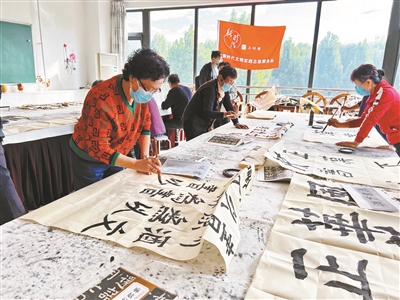 | 在马坊镇新时代文明实践所书画室里,十多位村民正在练习毛笔字 |