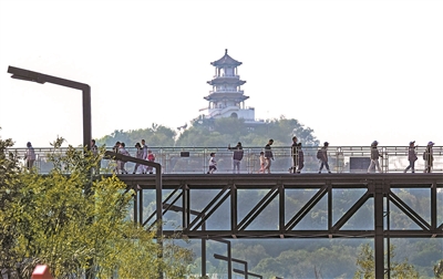 十一假期期间,首钢园内的高线公园空中廊道对外开放,市民可登上廊道逛遍首钢园的景点。