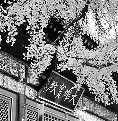 另外,寺的西边还有一株略小的银杏树,是后来补种的“配王树”。这棵树高约30余米,直径3米左右,目前叶片也已经转变为金黄色。与帝王树相比,配王树也毫不逊色,秋风吹过,叶片纷纷飘落,在寺内红墙灰瓦的映衬下熠熠生辉,尽显古刹神韵。