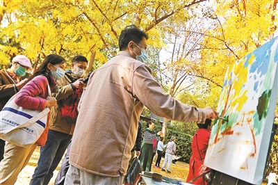 每年一进入11月,地坛公园内的200余株银杏树就被“染成”金黄色,形成“红墙金叶”这一独特景观。11月1日上午,地坛公园内“园林四季 秋之华彩”金秋银杏活动吸引了不少青年艺术家、艺术爱好者和游园群众。7位画家相约而来,在地坛公园内用画笔定格美景、描绘金秋。