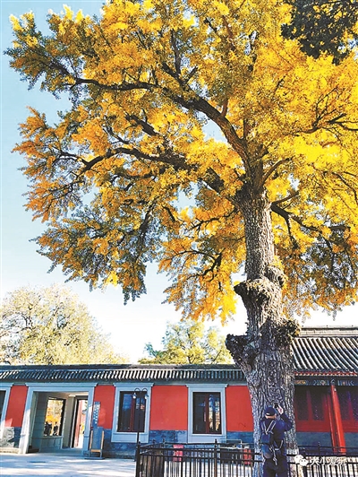 随着深秋到来,金黄色的叶子落了一地。两株古银杏都十分高大,树干粗壮,枝叶繁茂,要站得高、站得远,找好角度才能把它们拍进镜头里。金黄的银杏配上红墙青瓦的殿宇特别有意境,来这里的人们,无不举着相机,或站在假山上,或站在墙根下,用心地记录着古刹秋色。