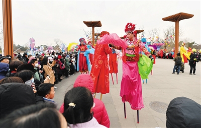 2月5日,北京世园公园,市民观看踩高跷表演。新京报记者 陶冉 摄