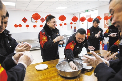 2月5日,北京铁路公安处北京北站派出所,民警一起动手包汤圆。新京报记者 郑新洽 摄