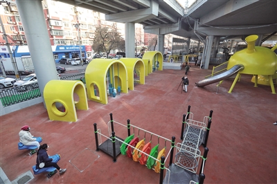 现场可看到,根据桥下空间资源情况,场地划分为儿童游乐区、综合运动区、配套服务区,功能鲜明。在色彩搭配上,整体以北京城市色彩主旋律“丹韵银律”为基础,蓝灰色系与暖黄色系相间,提升空间色彩明度及趣味性。
