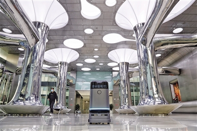 2月9日,中关村东升科技园,极光壹号PRO机器人在大厅清扫保洁。本版图片/新京报记者 薛珺 摄