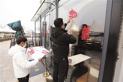1月12日,蓝色港湾商家正在布置餐厅贴窗花。