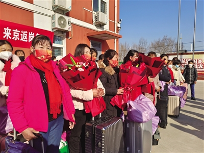 1月30日,返岗复工的家政人员收到鲜花。新京报记者 郑新洽 摄