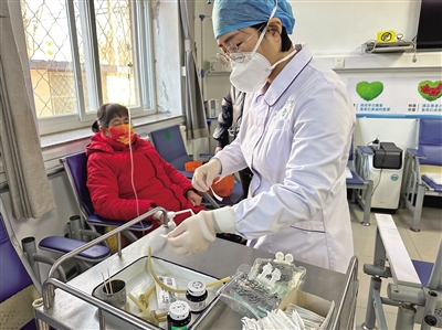 当天在中心护理岗当值的是于佳,她接过注射液,把姚琳带到中心一层的输液室,手脚麻利地检查、核对、穿刺、调速,两三分钟就把手里的活儿逐一安排好。姚琳和女儿坐在输液室的窗台边,药液从输液管的滴漏处滴落,身下的座椅垫是医务人员怕椅面冰凉特意准备的,身后的暖气也热烘烘的。
