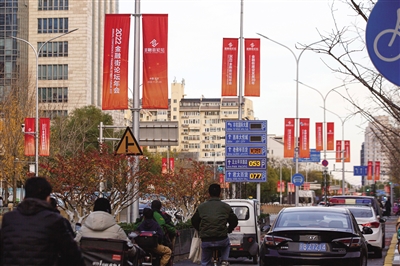 2022年11月21日,2022金融街论坛年会开幕。金融大街上,大型展板、灯杆旗帜、街边LED广告,营造出浓浓的论坛氛围。 资料图片/新京报记者 郑新洽 摄
