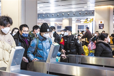 1月12日晚,北京丰台站,旅客排队进站,熊伟在一旁维护现场秩序。