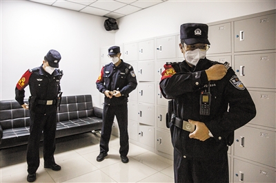 1月12日,北京丰台站,熊伟(右)与队员们在警务室佩戴好装备,准备接班。