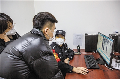 1月16日,北京丰台站,熊伟带着丢失手机的旅客回警务室调取监控,帮旅客寻找手机掉落位置。