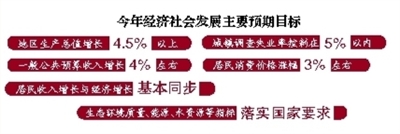 报告提出,今年北京经济社会发展主要预期目标是:地区生产总值增长4.5%以上,一般公共预算收入增长4%左右,城镇调查失业率控制在5%以内,居民消费价格涨幅3%左右,居民收入增长与经济增长基本同步,生态环境质量、能源、水资源等指标落实国家要求。