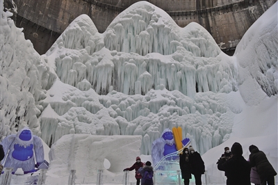 1月26日,几十米高的“冰瀑”是龙庆峡冰灯展区人气最旺的作品。新京报记者 王颖 摄