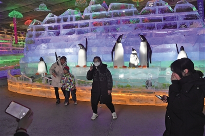 冰雕师傅们精心打造的一款“龙兔”冰雕和几十米高的龙庆峡冰灯的经典“冰瀑”是展览区人气最旺的作品。其中“龙兔”冰雕是将生肖兔和龙庆峡的“龙”进行了结合。现场一位游客告诉记者,他在北京上大学时曾和同学一起来过龙庆峡,今年是专门带着妻子和孩子一起来这里打卡,“感觉冰雕作品样式多了不少,冰雕技艺也精进许多。孩子第一次看冰灯,虽然冷,但玩得挺开心的。”这位游客称,自己属兔,今年是本命年,专门和家人在“龙兔”冰雕前合影留念。