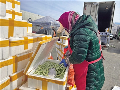 2月1日一早,新发地市场内车流如织,各大蔬菜交易区停满了车辆,一些货车甚至直接停到交易区外的马路边装货。市场各主要干道竟然在春节后很快出现了拥堵,让一些商户也感觉诧异,市场为此增设了现场交通疏导人员。在批发水菜的交易区,装豆芽的集装箱货车转弯掉头需要的空间比较大,为了让这些车辆顺利进场、驶离,疏导人员不得不用上了警戒线,将部分入口临时封闭,专供大型车辆通行。
