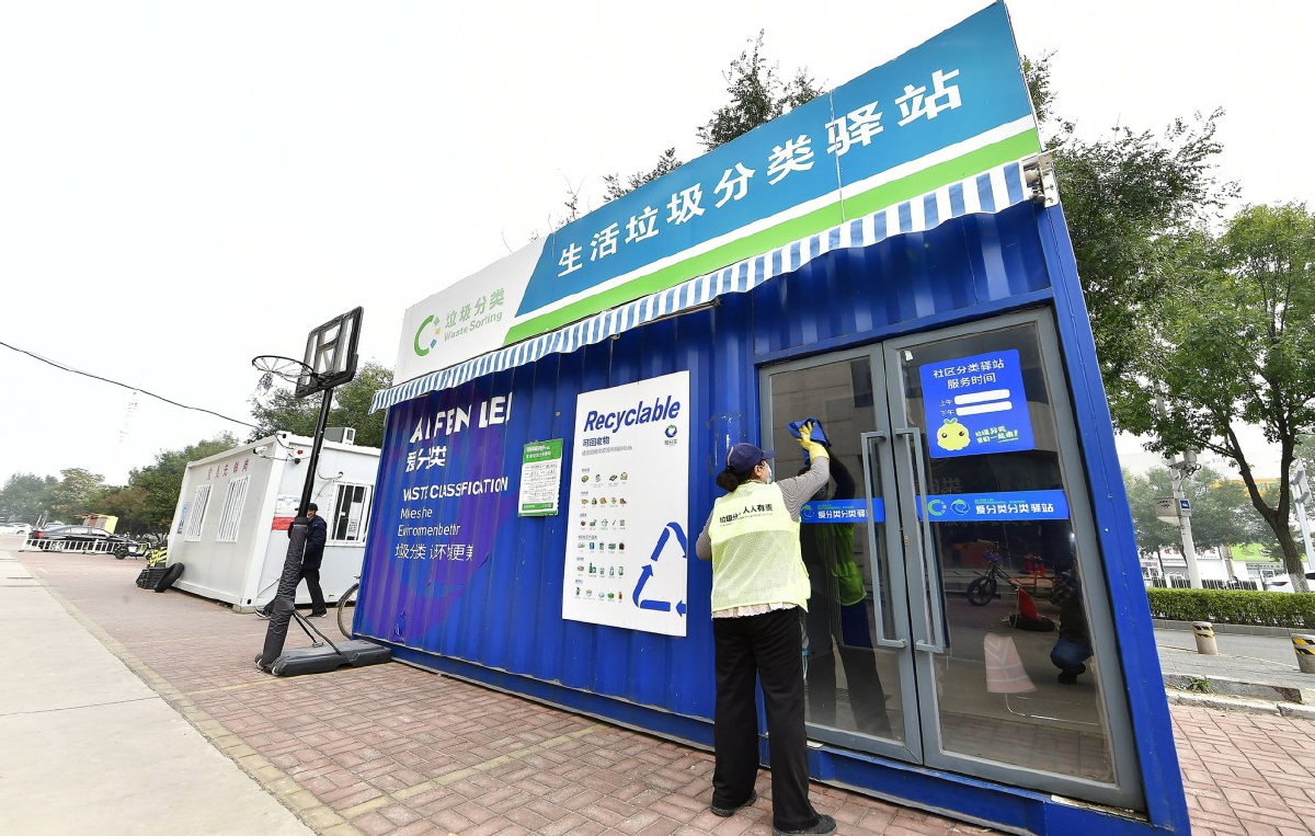 工作人员正在擦拭垃圾分类驿站玻璃门。记者 唐建/摄