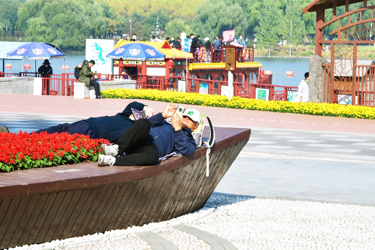 公园内,个别游客穿鞋躺在花坛边。记者 常鸣/摄