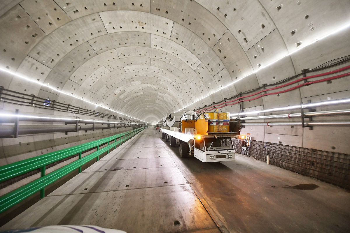 东线隧道内,专用车辆正在运输盾构机所用的管片与油脂。记者 常鸣/摄