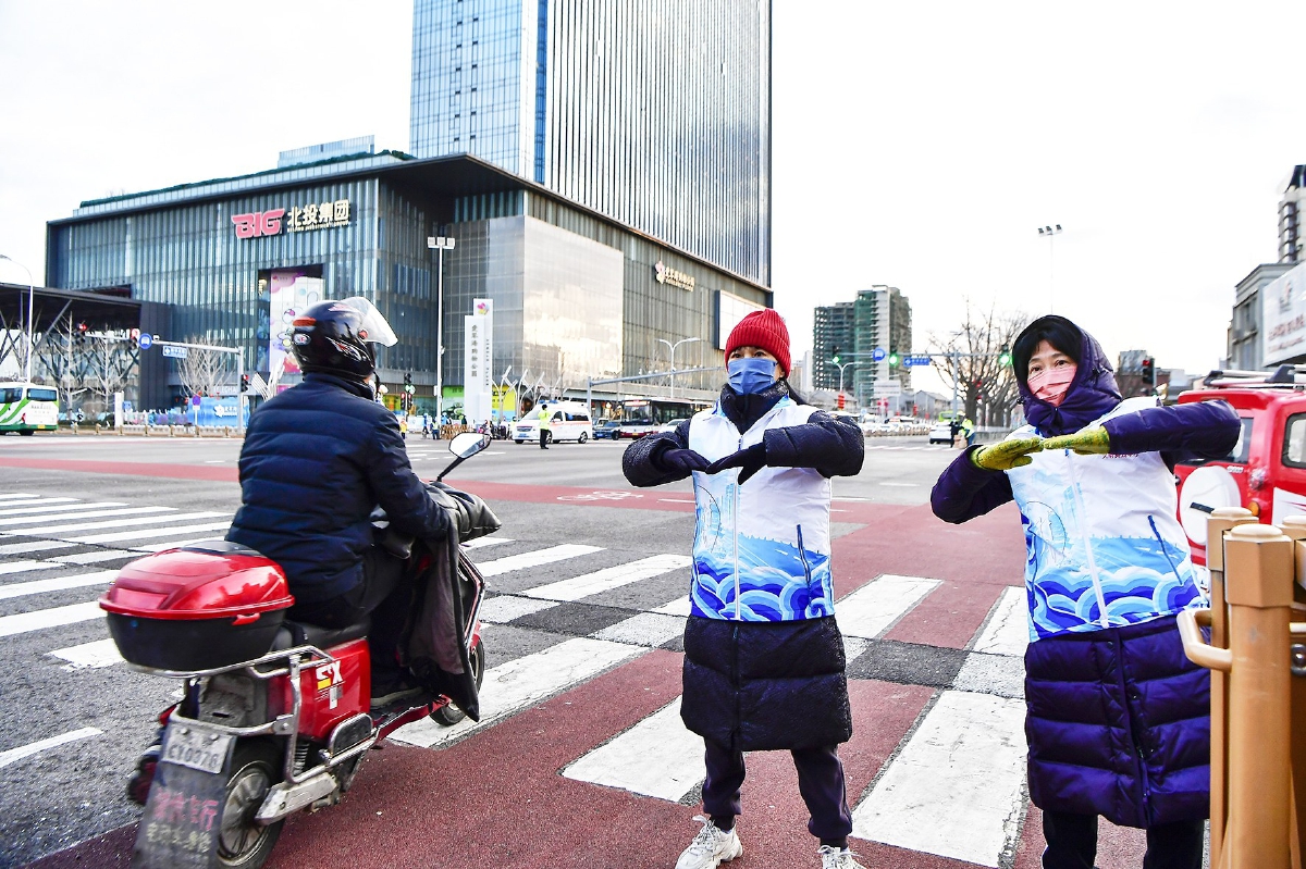 志愿者在路口引导行人、车辆文明通行。记者 唐建/摄