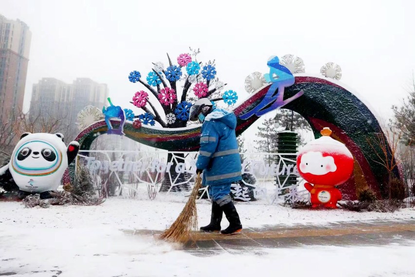 冬奥景观旁,环卫工人正在清扫积雪