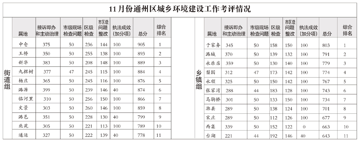 根据11月份通州区城乡环境建设工作考评结果,街道组中中仓办事处、玉桥办事处排名靠前,乡镇组中于家务乡、潞城镇排名靠前。在此,区环境建设管理办要求排名靠后的单位,继续加大环境整治力度,完善长效管控机制,确保发现问题及时整改,避免问题反弹。