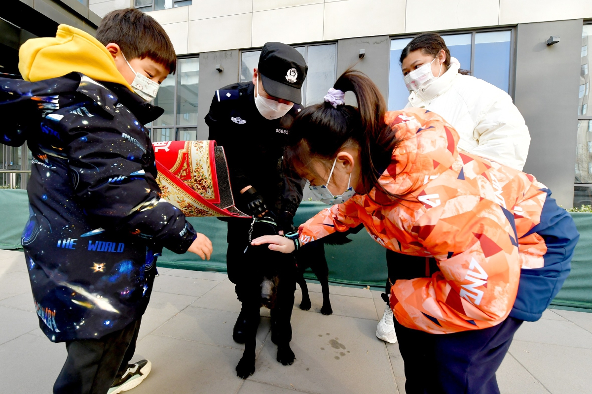 在民警的指导下,市民近距离接触了解警犬。记者 常鸣/摄