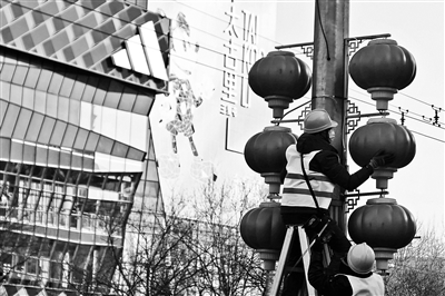 昨天上午,在朝阳区三里屯,几位工人师傅踩着梯子为沿街的树木缠绕漂亮的灯串,挂起红红火火的灯笼。原本光秃秃的大树仿佛穿上晚礼服一般,氛围感瞬间拉满。在蓝岛-芳草地商圈、亮马河风情水岸等区域,灯笼灯饰、景观小品,电子屏播放电子烟花、电子年画等也都布置了起来,节日氛围十足。