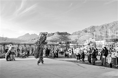 自除夕当天开始,每天下午四点,伴随着锣鼓音乐声,怀柔区渤海镇北沟村瓦厂酒店的舞狮和秧歌表演都会准时拉开序幕。表演者们身着彩衣盛装一路载歌载舞,与游客和村民们互动演出,一片欢声笑语。“今年过年想着换个方式,就带着家人来到瓦厂。这里有剪纸、写福字等丰富多彩的春节活动,还有舞狮和秧歌表演等,和这么多人一起过大年,感觉回到了小时候。”游客王女士说。
