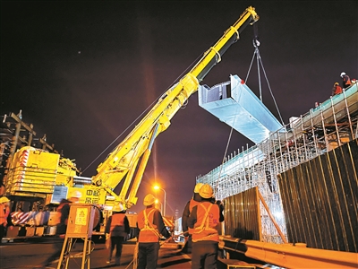 京雄高速公路五环立交项目上跨五环主线桥首片钢梁的成功架设,为京雄高速公路完成今年通车的目标任务打下了基础。