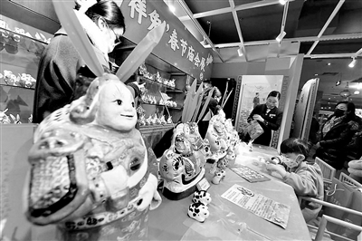 春节期间,前门大街换上亮眼的新装扮。老舍茶馆新春室内文化活动已连续多年举办,今年一楼大厅处的“吉祥兔”打卡区更是成为新春打卡地,与硕大的兔儿爷彩灯拍照集赞、打卡,就能领取纪念品一份。茶馆二层的“泥彩塑兔儿爷作品展”,一秒拉回老北京人儿时的记忆。展区内可以了解兔儿爷历史文化,还可以体验画兔儿爷活动,将心仪“福兔”带回家。
