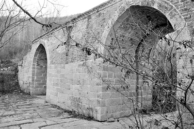 在关下反复踱步,见地面铺着大块条石,西侧门洞走水,条石两端凿出燕尾槽,中间用了铁扣连接,当地人形象地称为蝴蝶扣。条石拉手,连为一体,以防洪水冲击,现在铁扣已被取走,只存空形。洞内两壁有闸板槽,约十多厘米宽。抬头仰望券顶,闸门已无,上可透天。缝隙中看券门,青砖垒砌,三券三伏。