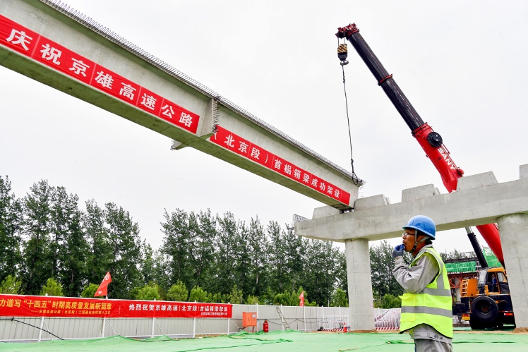 4月25日,京雄高速公路北京段首榀30米箱梁在八工区承建的第三段高架桥正式开始架设,标志着京雄高速北京段工程全面提速。记者 邓伟/摄