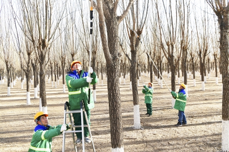 大年三十,潞城镇北运河大堤上,几名身穿深绿色工服的森林养护工手拿修枝剪正在为路旁生态林的花灌木修剪树枝。