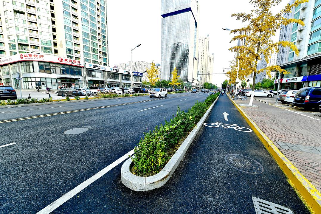 在慢行示范区建设中,这样的创新还有不少。为了确保行人安全,万盛南街辅路两侧设置了3.5米宽的自行车道,最外侧的人行便道也十分宽阔。道路建设中还对符合条件的路口进行渠化,全线26个规划灯控路口均设置安全岛、人行道桩,确保行人、非机动车和机动车各行其道。
