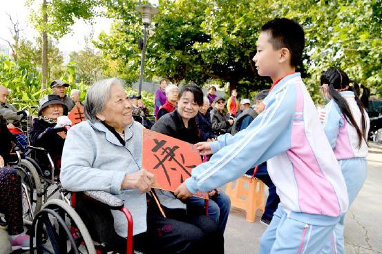 重阳节,小学生为老人送祝福。